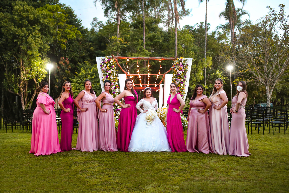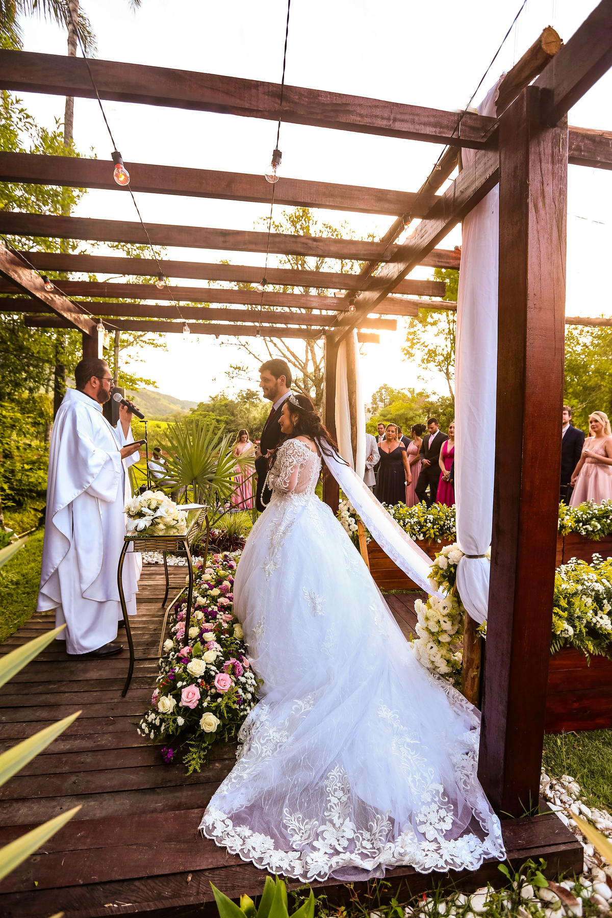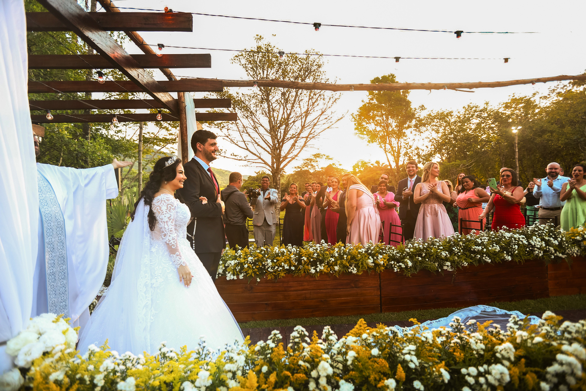 Fotografei um casamento mágico, onde o por do sol pintou o campo com sua luz dourada.