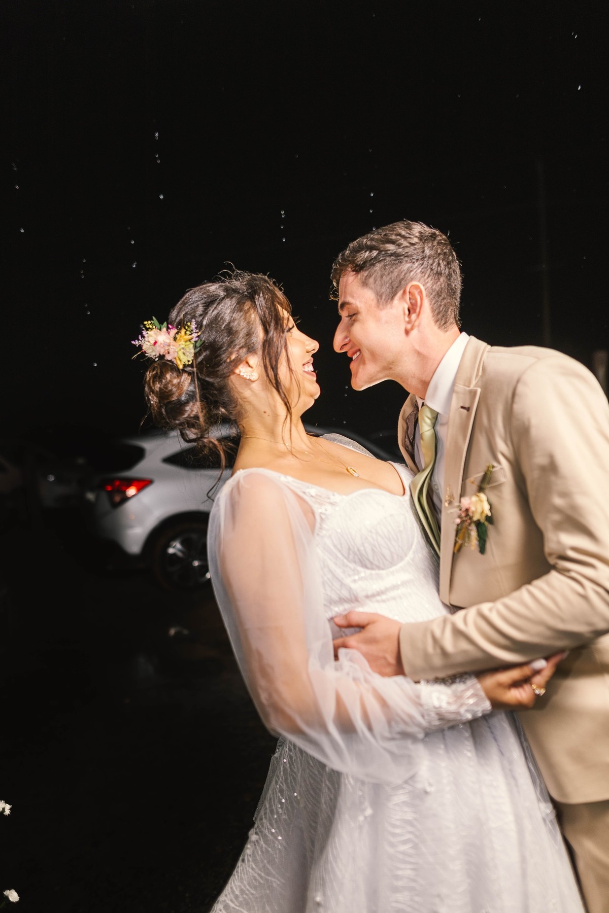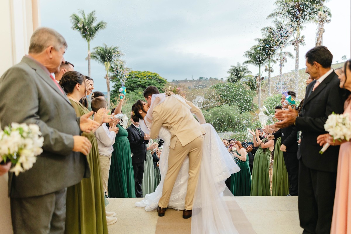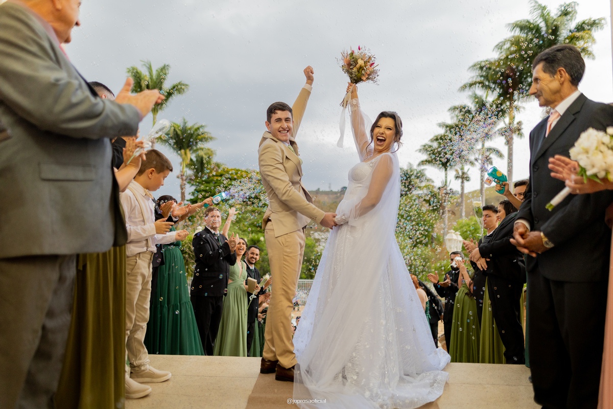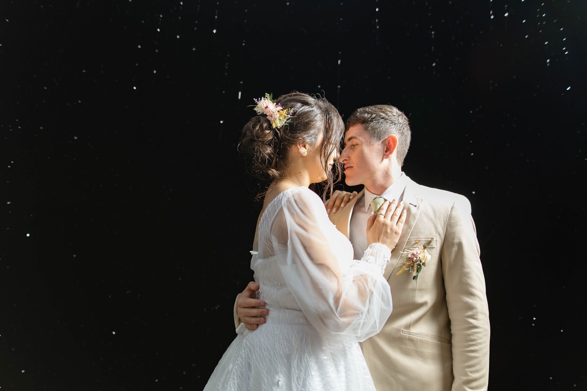 As gotas de chuva transformaram o cenário em algo ainda mais encantador logo após a cerimônia, criando fotos inesquecíveis e cheias de emoção.