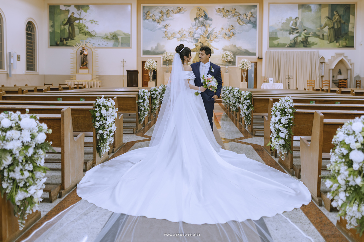 A cerimônia aconteceu na belíssima Igreja de Santo Antônio, cenário perfeito para uma noiva delicada, sorridente e cheia de emoção, enquanto o noivo esperava com aquele olhar alegre e ansioso no altar. Cada detalhe parecia traduzir o amor e a leveza dos dois.