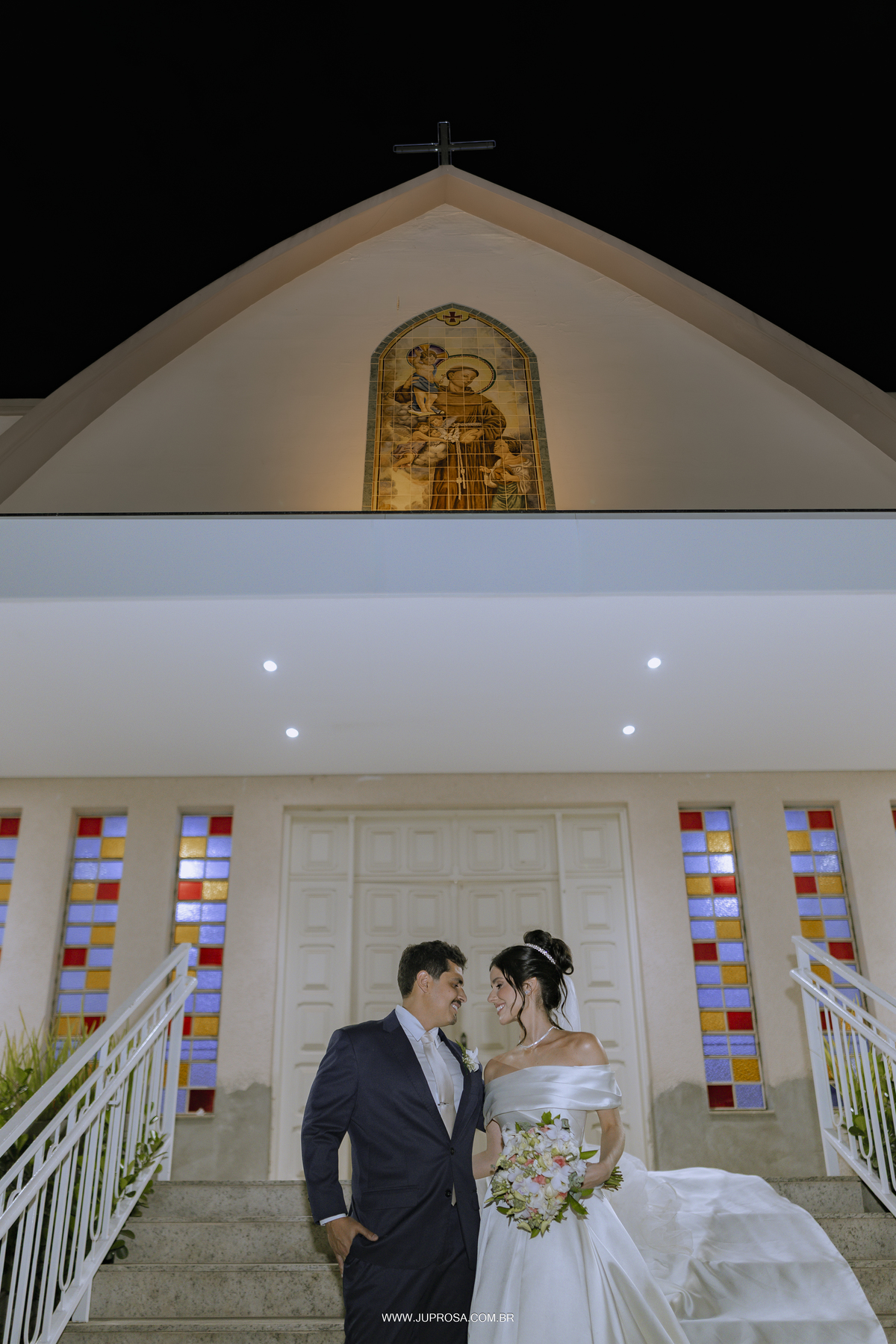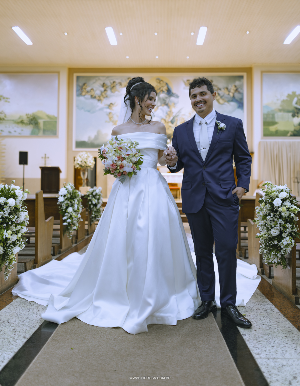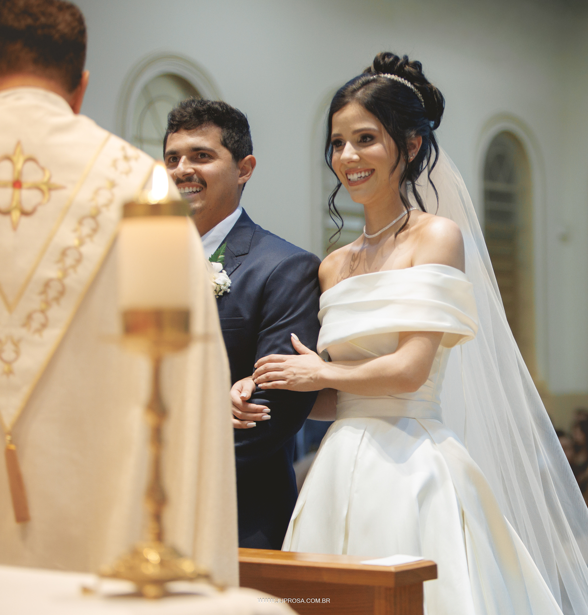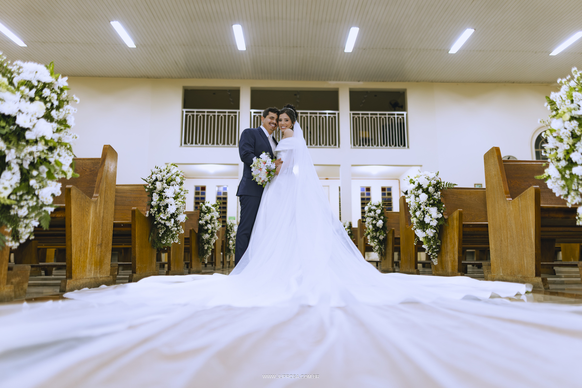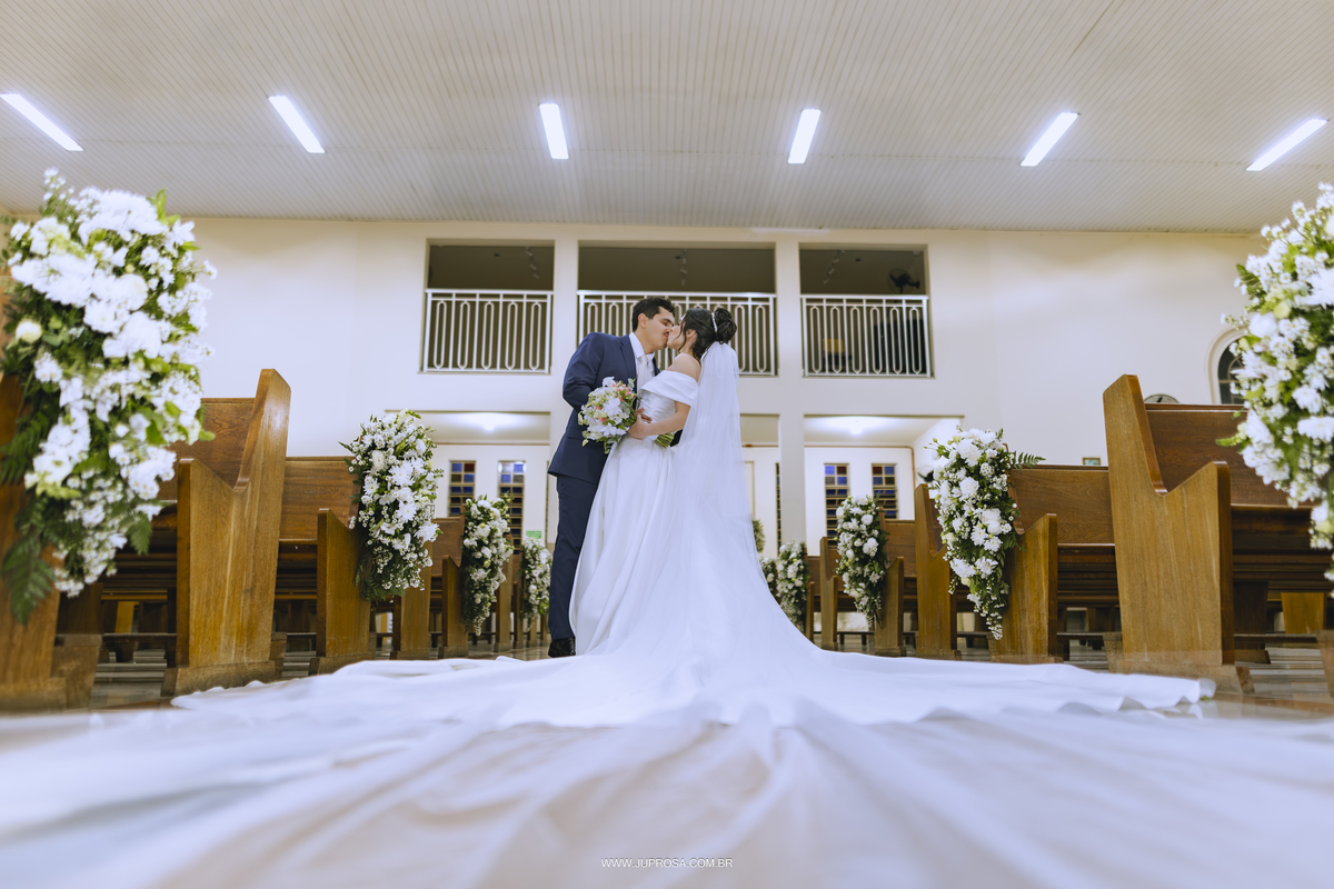 A cerimônia aconteceu na belíssima Igreja de Santo Antônio, cenário perfeito para uma noiva delicada, sorridente e cheia de emoção, enquanto o noivo esperava com aquele olhar alegre e ansioso no altar. Cada detalhe parecia traduzir o amor e a leveza dos dois.